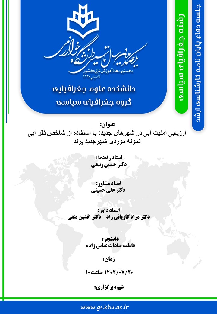 جلسه دفاع کارشناسی ارشد خانم فاطمه سادات عباس زاده ارزیابی امنیت آبی در شهرهای جدید؛ با استفاده از شاخص فقر آبی نمونه موردی شهرجدید پرند