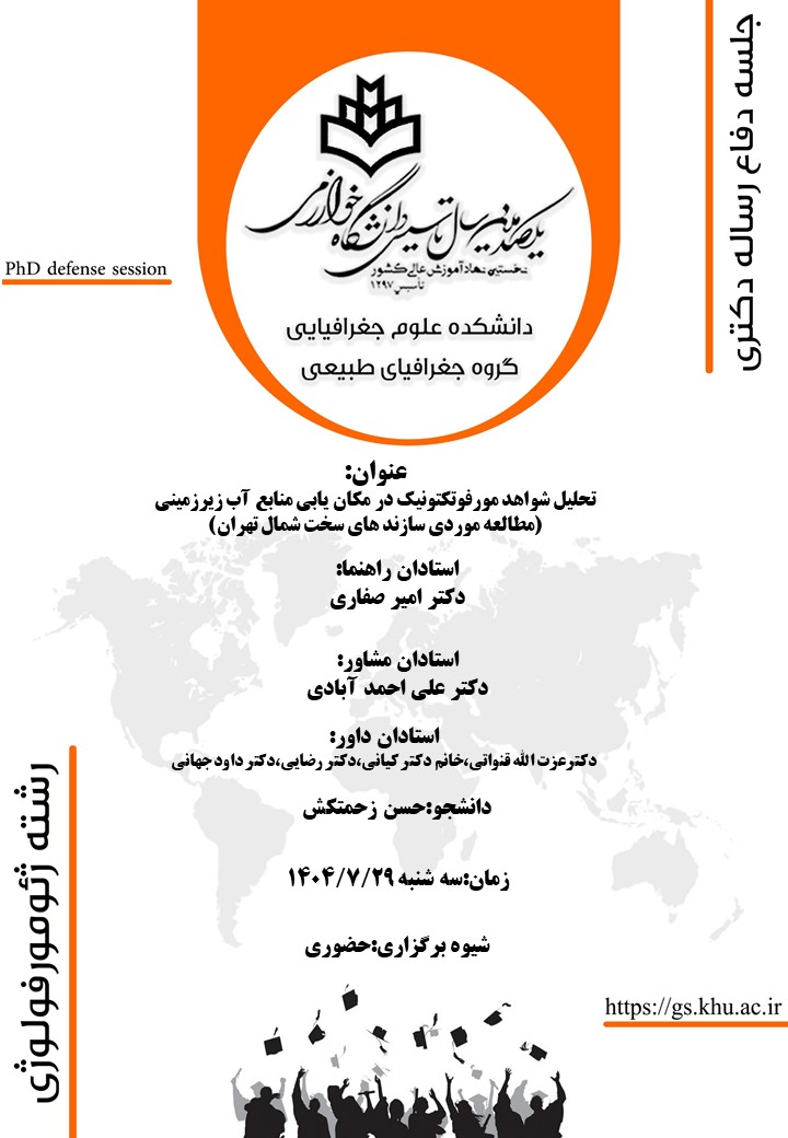 جلسه دفاع رساله دکتری آقای حسن زحمتکش حلیل شواهد مورفوتکتونیک در مکان یابی منابع آب زیرزمینی (مطالعه موردی سازند های سخت شمال تهران)