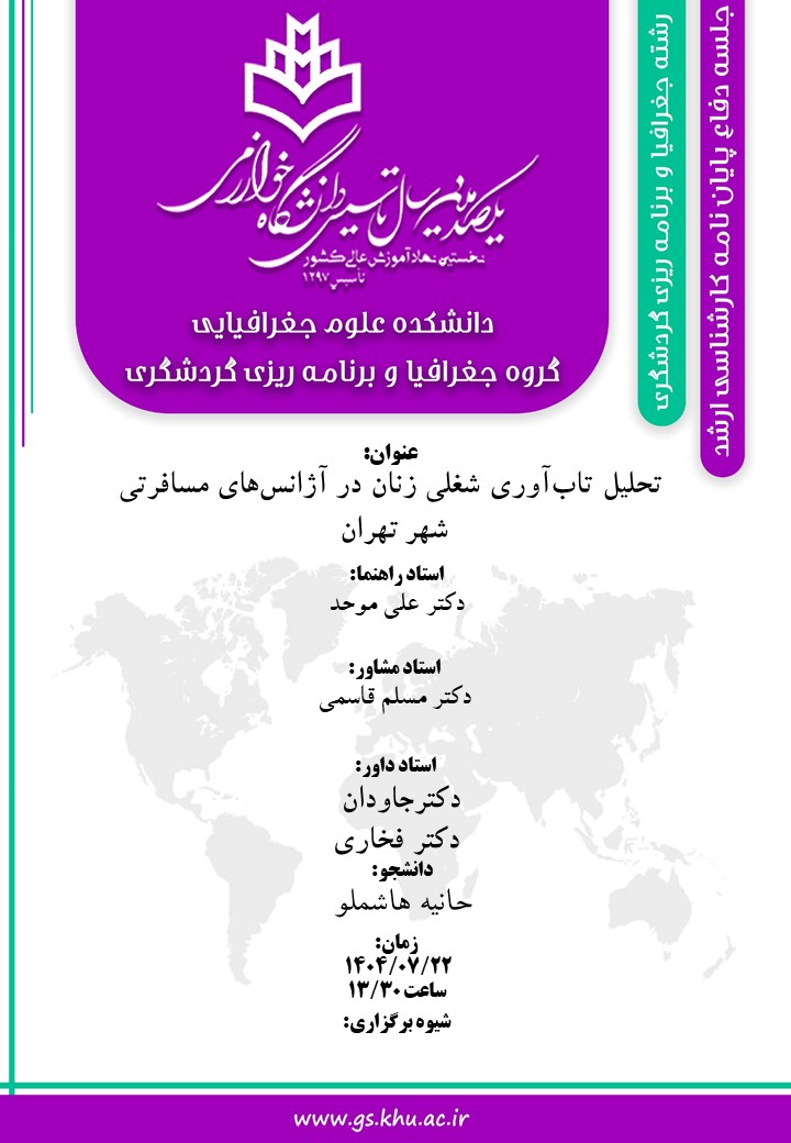 جلسه دفاع کارشناسی ارشدخانم حانیه هاشملو تحلیل تاب‌آوری شغلی زنان در آژانس‌های مسافرتی شهر تهران