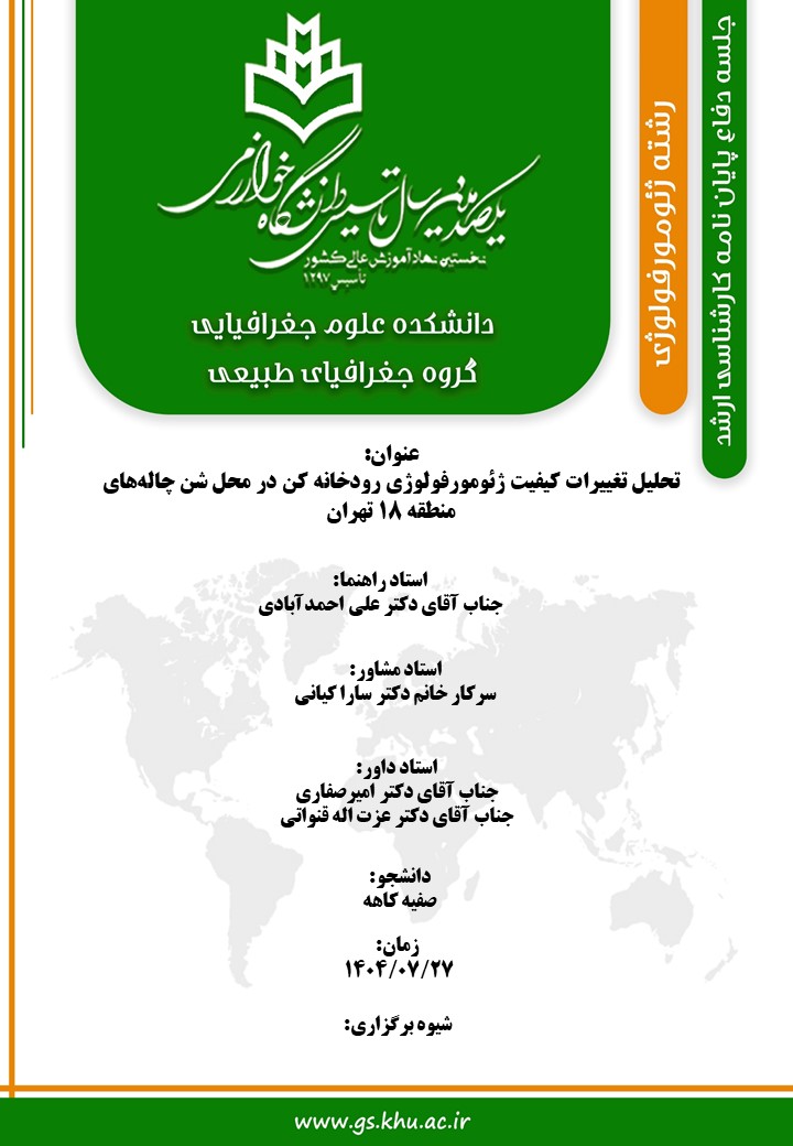جلسه دفاع کارشناسی ارشد خانم صفه کاهه تحلیل تغییرات کیفیت ژئومورفولوژی رودخانه کن در محل شن چاله‌های منطقه ۱۸ تهران