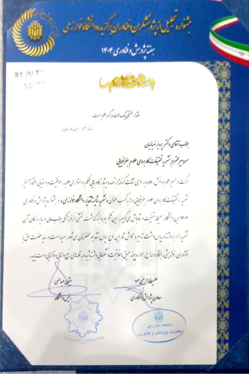 کسب عنوان نشریه شایسته تقدیر دانشگاه خوارمی (نشریه تحقیقات کاربردی علوم جغرافیایی)